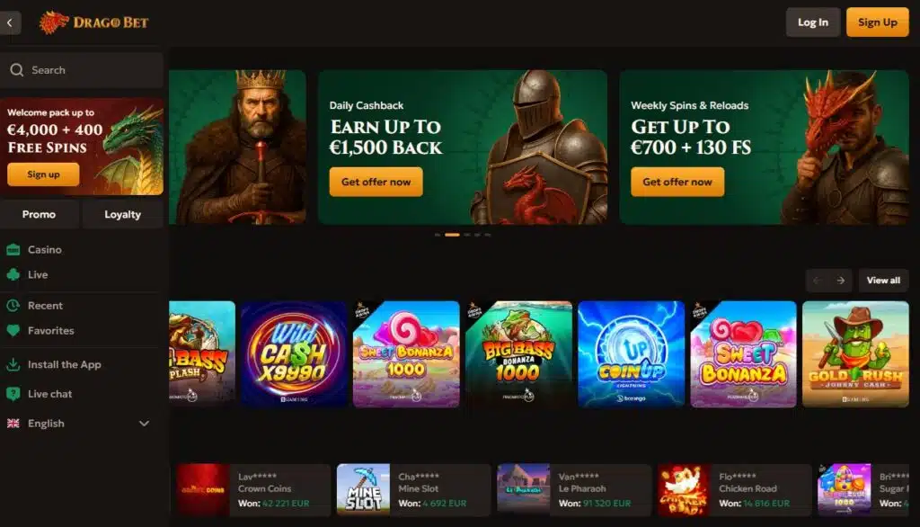 Dragobet Casino biedt een enorm spelportfolio van meer dan 7.500 games van topspelontwikkelaars zoals Pragmatic Play, Evolution, NetEnt, Hacksaw Gaming en Booming Games.